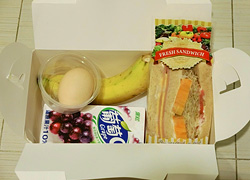 中はサンドイッチ、バナナ、ゆで玉子、グレープジュース、お手拭き