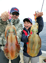 更にちゃこがピンクスギGM(ゴールドマーブル)(4035N)で700gのアオリイカ、溝越さんが800gのアオリイカとダブルヒットで締めくくった。