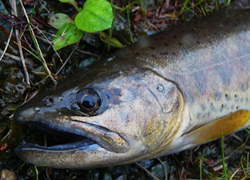 厳つい面構えのアマゴ。増水時にササ濁りの堰堤下のプールでキャッチした。