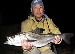 さて話は変わるが、庵治半島のサーフで相変わらずメバルが好調だ。詳細は雑誌にも、またホームページにも書く予定なので、そちらをご覧になっていただくとして、男爵が手に持っているクラスの良型が毎夜のごとくに釣れている。しかも、もう1ヵ月以上つづいているのだから驚かざるを得ない。ここだけの話だが、尺メバルも顔をみせることがある。