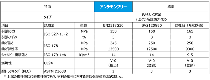 表1 「アンチモンフリー難燃ナイロン樹脂」性能表