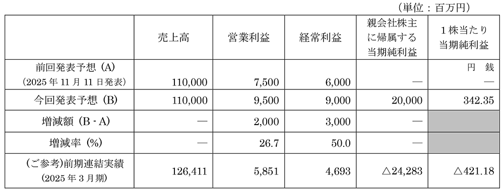 営業外収益(為替差益)、特別利益(固定資産売却益及び事業譲渡益)、特別損失(事業構造改善費用)の計上及び2026年3月期通期業績予想の修正に関するお知らせ