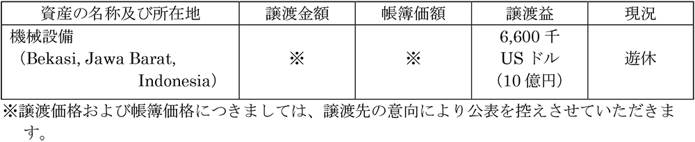 当社は、2024年11月28日に公表いたしました事業再生計画(以下「本計画」といいます。)を株式会社地域経済活性化支援機構の支援のもと実行中になりますが、本計画実行の一環としてP.T. Emblem Asiaが所有する機械設備を譲渡することを決定いたしました。