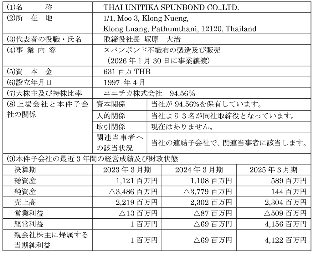 当社は、2026年4月27日開催の取締役会において、当社連結子会社のTHAI UNITIKA SPUNBOND CO.,LTD.(以下「TUSCO」という。)を解散することを決議いたしましたので、下記の通りお知らせいたします。