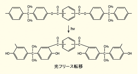ポリアリレート樹脂は紫外線吸収能力が高く、耐候性に優れています。ポリアリレート樹脂がこのような特性を有するのは、紫外線エネルギーを吸収し、下記図のようなフリース転移反応を起こし、樹脂表層部にベンゾフェノン構造を生じるためです。これにより、ポリアリレート樹脂は400nm以下の光線を遮断するという機能を発揮します。また、フリース転移反応に伴い色調が変化(黄色化)しますが、透明性にはほとんど影響はありません。